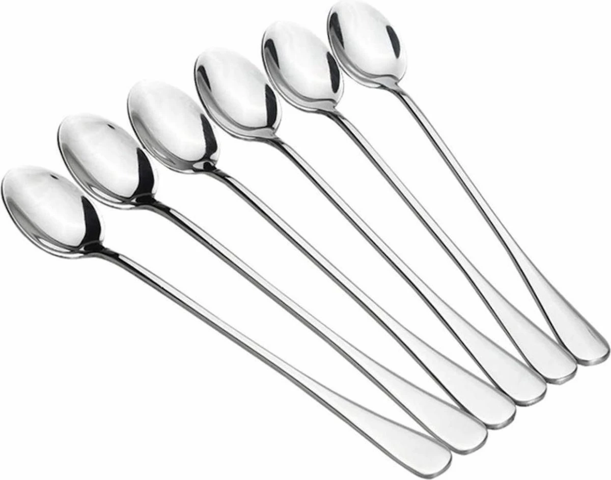 Set van 6 roestvrijstalen Latte Macchiato lepels. Handig om in lange glazen te roeren of uit te scheppen.